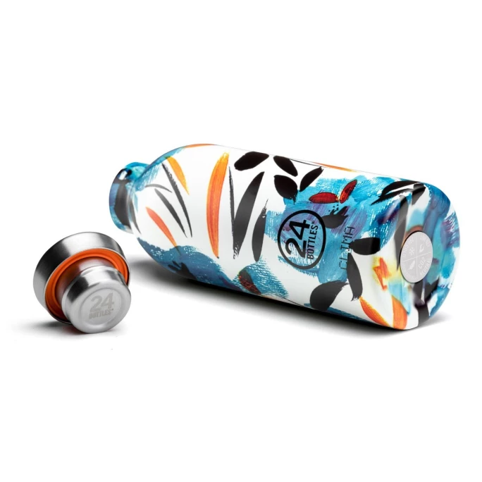 Diese Isolierflasche trägt ihr Versprechen im Namen: Die Clima Bottle der italienischen Marke 24 Bottles beeindruckt durch ihr effizientes Isoliersystem. Die Clima Bottle hält im Sommer Ihre Getränke 24 Stunden lang kalt und im Winter ihre Heißgetränke wie Tee, Kaffee oder Glühwein bis zu 12 Stunden warm. Neben den Isolierfähigkeiten der 24 Bottles Clima Flasche ist die aus rostfreiem 18/8 Edelstahl konzipierte Flasche auch so hergestellt, dass sie frei von BPA und Phtalathen ist. Die Isolierflasche Clima Bottle ist mit einem silikonisoliertem Schraubverschluss ausgestattet, so dass der Deckel wirklich komplett verschließt. Dadurch können Sie die Clima Bottle von 24 Bottles in ihrem Rucksack bei Wanderungen verstauen oder in ihrer Arbeitstasche auf dem Weg zur Arbeit. Die Clima Bottle eignet sich auch für kohlensäurehaltige Getränke. Die Flasche sollte nach dem Gebrauch per Hand gewaschen werden.