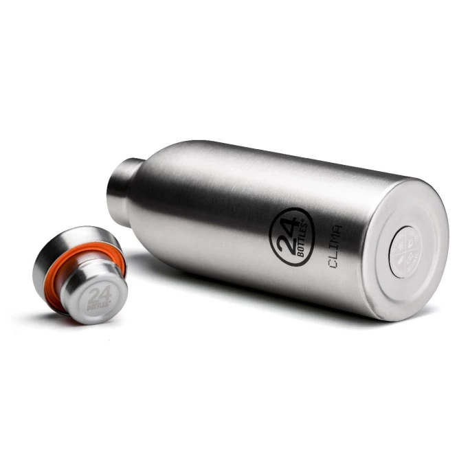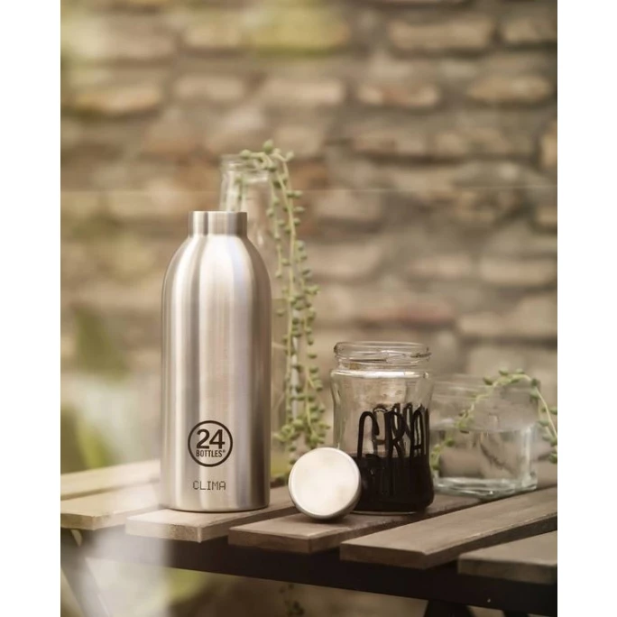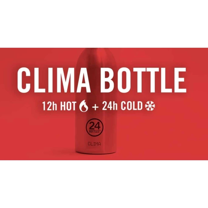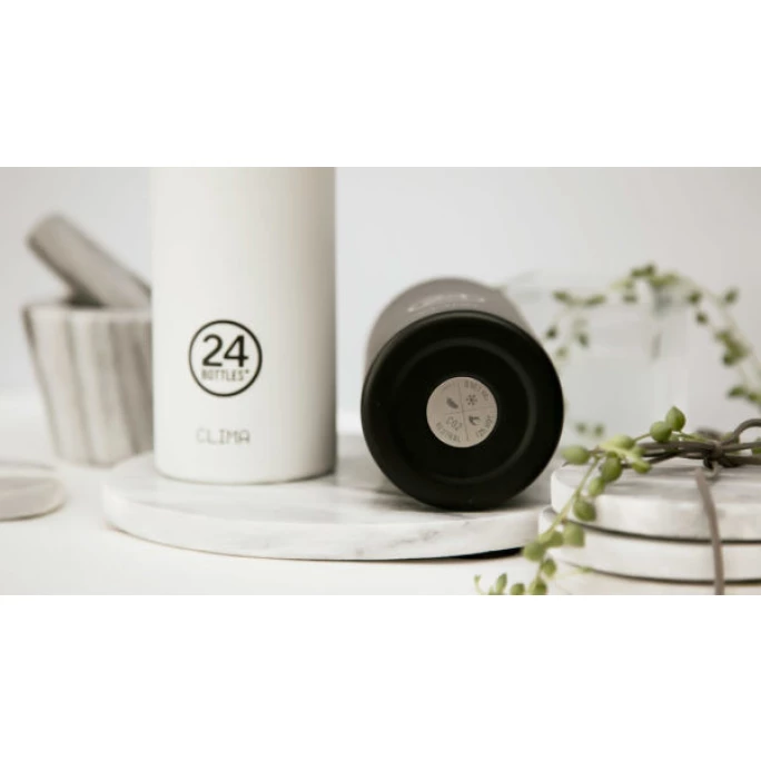 Diese Isolierflasche trägt ihr Versprechen im Namen: Die Clima Bottle der italienischen Marke 24 Bottles beeindruckt durch ihr effizientes Isoliersystem. Die Clima Bottle hält im Sommer Ihre Getränke 24 Stunden lang kalt und im Winter ihre Heißgetränke wie Tee, Kaffee oder Glühwein bis zu 12 Stunden warm. Neben den Isolierfähigkeiten der 24 Bottles Clima Flasche ist die aus rostfreiem 18/8 Edelstahl konzipierte auch so hergestellt, dass sie frei von BPA un Phtalathen ist. Die Isolierflasche Clima Bottle ist mit einem silikonisoliertem Schraubverschluss ausgestattet, so dass der Deckel wirklich komplett verschließt. Dadurch können Sie die Clima Bottle von 24 Bottles in ihrem Rucksack bei Wanderungen verstauen oder in ihrer Arbeitstasche auf dem Weg zur Arbeit. Die Clima Bottle eignet sich auch für kohlensäurehaltige Getränke. Die Flasche sollte nach dem Gebrauch per Hand gewaschen werden.